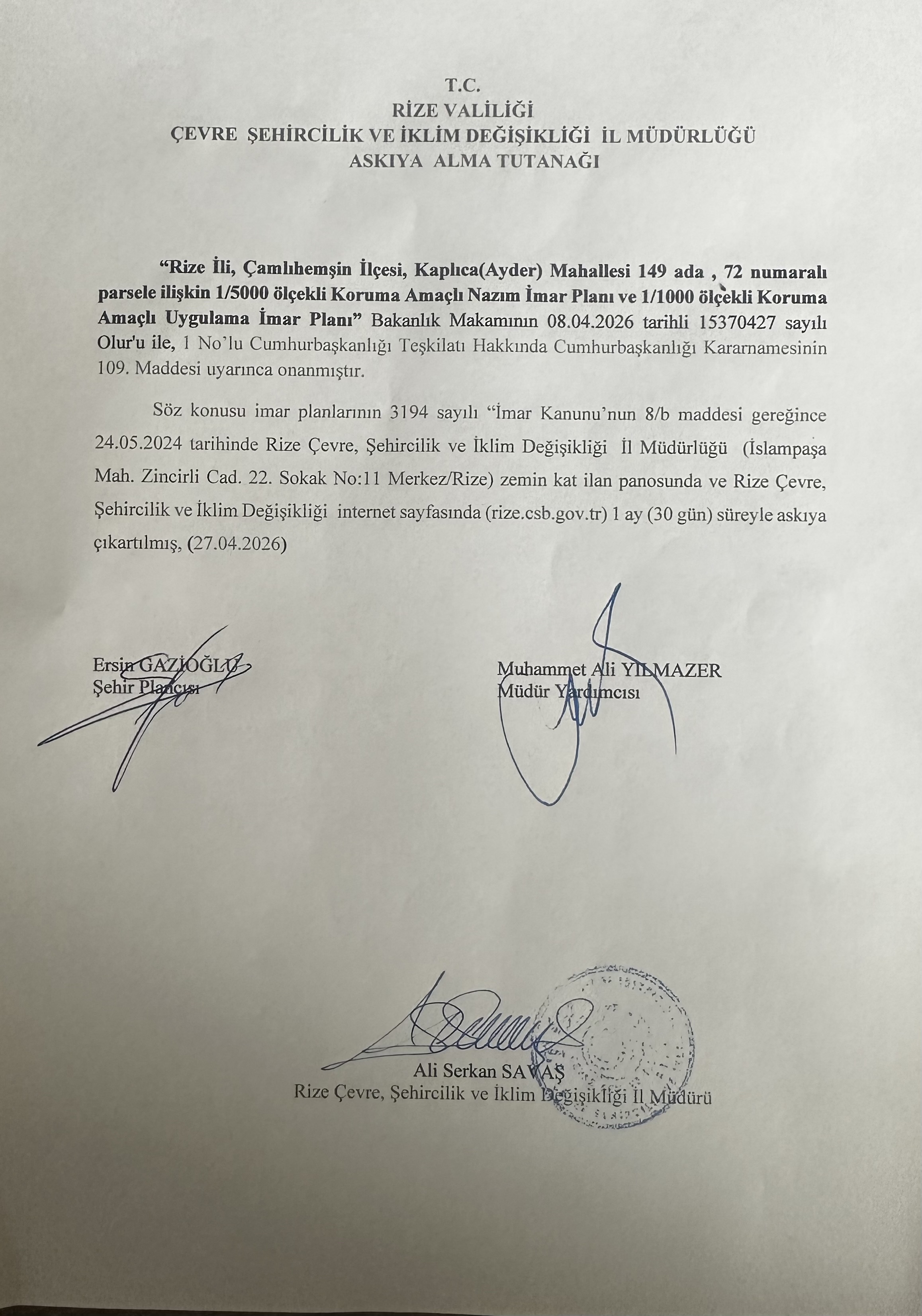“Rize İli, Çamlıhemşin İlçesi, Kaplıca(Ayder) Mahallesi 149 ada , 72 numaralı parsele ilişkin 1/5000 ölçekli Koruma Amaçlı Nazım İmar Planı ve 1/1000 ölçekli Koruma Amaçlı Uygulama İmar Planı” Bakanlık Makamının 08.04.2026 tarihli 15370427 sayılı Olur'u ile, 1 No’lu Cumhurbaşkanlığı Teşkilatı Hakkında Cumhurbaşkanlığı Kararnamesinin 109. Maddesi uyarınca onanmıştır.